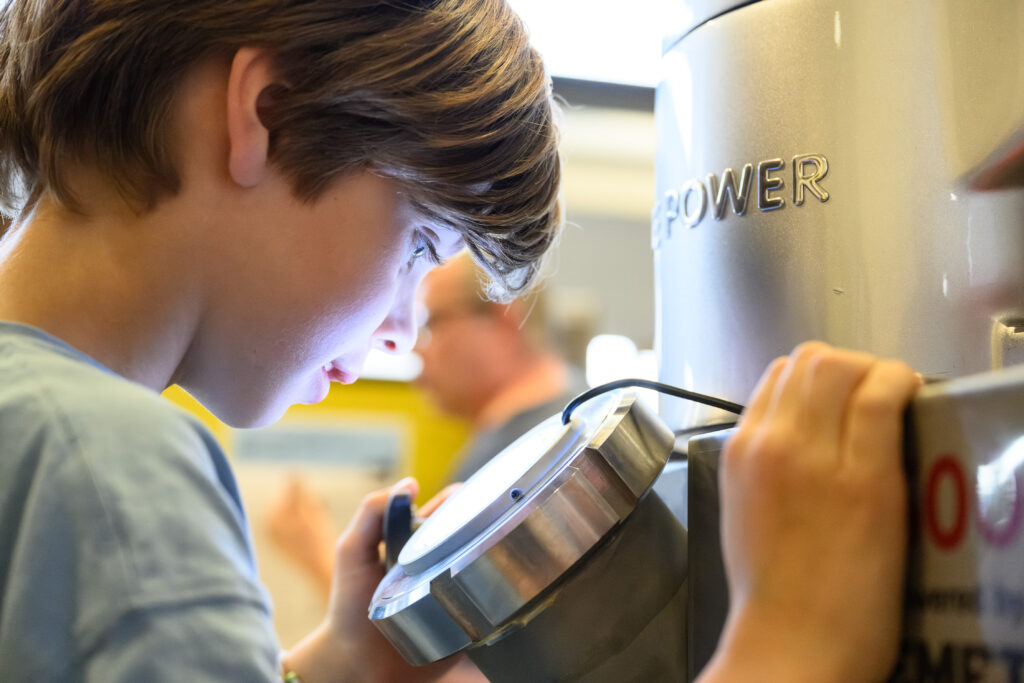 Im internationalen Ropeway Training Center von Doppelmayr in Dornbirn entdecken die Nachwuchsforschenden, wie stark man sein muss, um eine Seilbahn zu bauen und damit das physikalische Prinzip des Flaschenzugs. Stolz zeigten die Kleinsten, wie sie durch Kraftwandlung auf einmal mit Leichtigkeit 40 kg anheben. Mittels Virtual Reality durfte auch Jede*r gefahrlos das Schweißen ausprobieren und zudem entdecken, wie eine Seilbahn überhaupt gesteuert wird. Bei Stationen wie diesen wurde klar, wie wissenschaftliche Grundlagen und moderne Technologien in unserem Alltag oft ganz unbemerkt zum Einsatz kommt.
