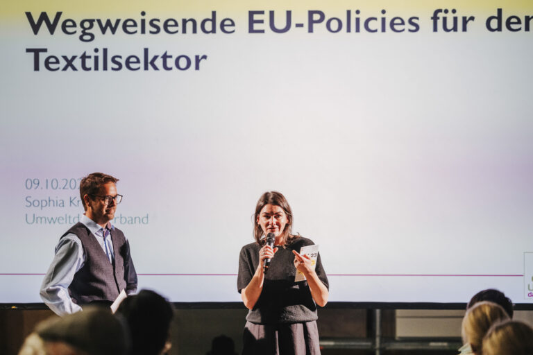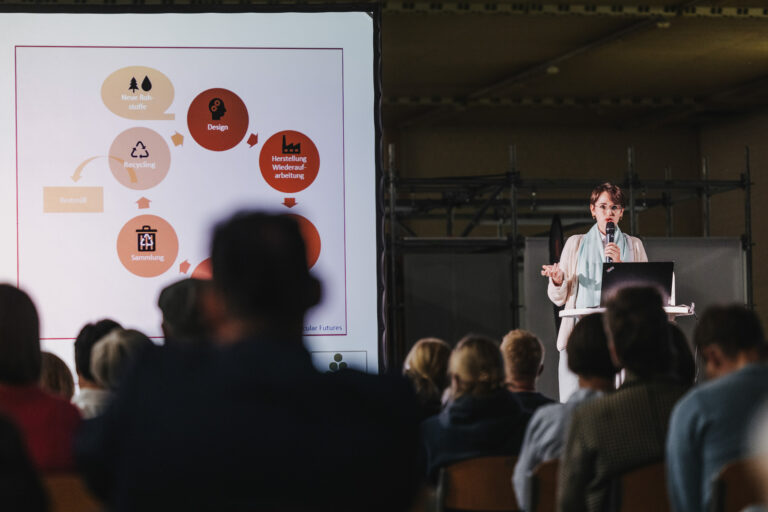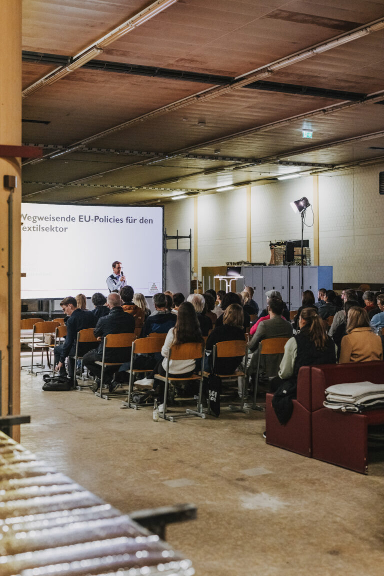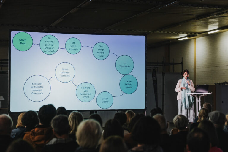 Sophia Kratz vom Umweltdachverband beleuchtete in ihrem Vortrag „Wegweisende EU-Policies für den Textilsektor“ die wirtschaftspolitischen Herausforderungen, denen die Textilbranche auf dem Weg zu einer Kreislaufwirtschaft gegenübersteht. Des Öfteren fiel der Begriff „Ultra Fast Fashion“ in Bezug auf die Schwierigkeit einer Wiederverwendung solcher Textilien bzw. die damit wachsenden Müllberge. Die EU-Taxonomie möchte solchen Entwicklungen mittels Gesetzgebung entgegenwirken. Sophia Kratz gab dabei Einblicke in den Entwicklungsstand relevanter EU-Richtlinien des EU Green Deal sowie bezüglich Ökodesign-Verordnung, Abfallrahmenrichtlinie, Lieferkettengesetz, EU-Textilstrategie und der Österreichischen Kreislaufwirtschaftsstrategie.